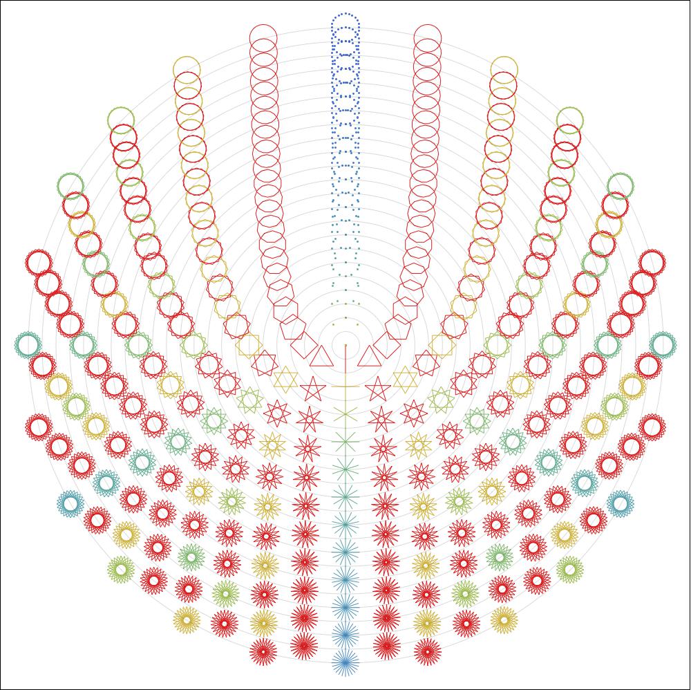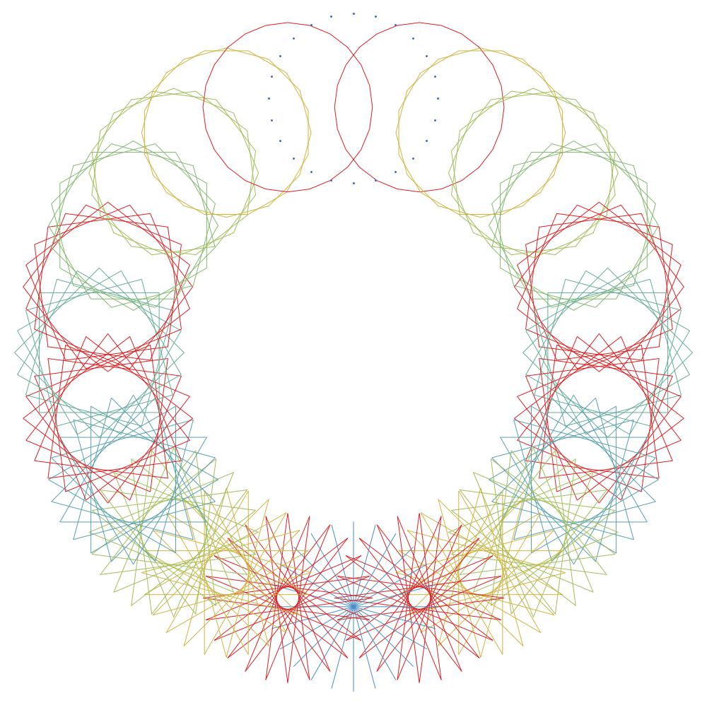 For most of my animations, I used Cinderella (http://www.cinderella.de). The basic element is made of a line segment, another segment coming off the first’s endpoint, and then a large number of segments that follow in “geometric sequence”. As the first is to the second–in terms of size and angle–so is the second to the third, the third to the fourth, and so on. You can produce an enormous variety of shapes using this simple element. The art of it is finding ones you like!