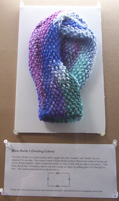 This site is full of articles and about and patterns for all kinds of cool mathematical objects – like Klein bottles (which make great hats, by the way)!  In her post about knitted Klein bottles (and all of the other objects she makes), Sarah-Marie not only describes how to knit the objects but a lot of mathematics about them.  I don’t know about you, but I always find mathematical ideas easier to understand when I can make models of them, or at least read about models being made.  Sarah-Marie does a great job of blending mathematical descriptions with how-to-make-it recipes.
