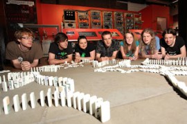 • Hi, Cristopher! It took a very, very long time to figure out how to set up the domino computer. A few of my high school students did it– they used a lot of trial and error and learning from mistakes! I think we used almost 2,000 dominoes. Thanks for the great questions!