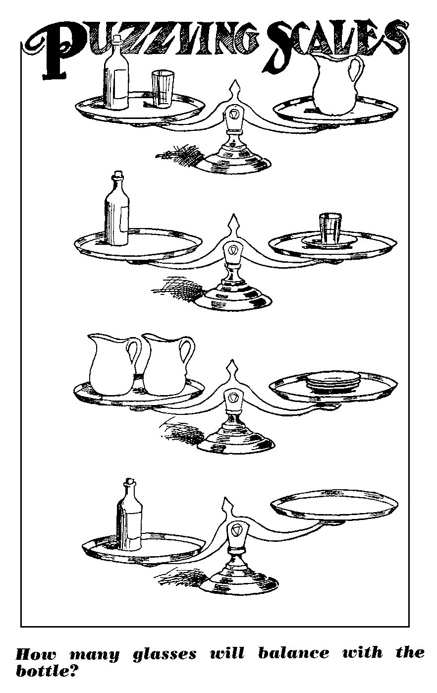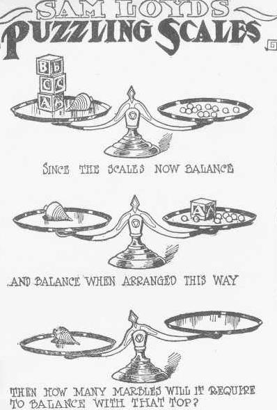 2. The name Sam Loyd sounds familiar but after reading the article about him I realized that I didnt know who he was at all. Im not a fan of chess but puzzles are always fun when you understand how to solve them correctly. Torque is something that Ive never heard about when dealing with scales and balancing. In the lesson that I’m learning right now I’m using a form of balance that helps me solve equations with variables on both sides by simply drawing a line down the wherever the equal sign is. I feel that excercises are good for the brain when your first period of the day is math; they wake up your brain! The excercises in this post seem challenging and fun, but will give a brain a good workout!
