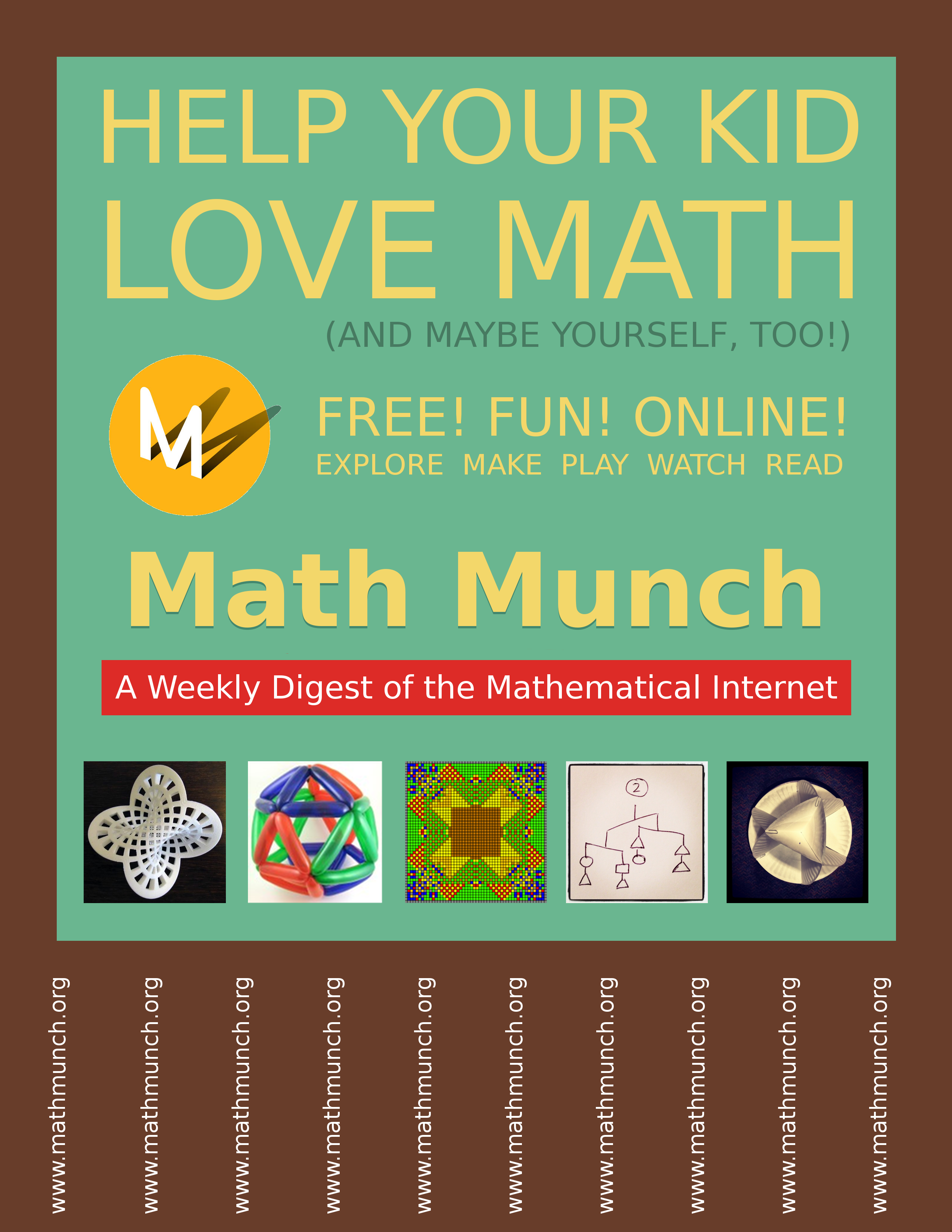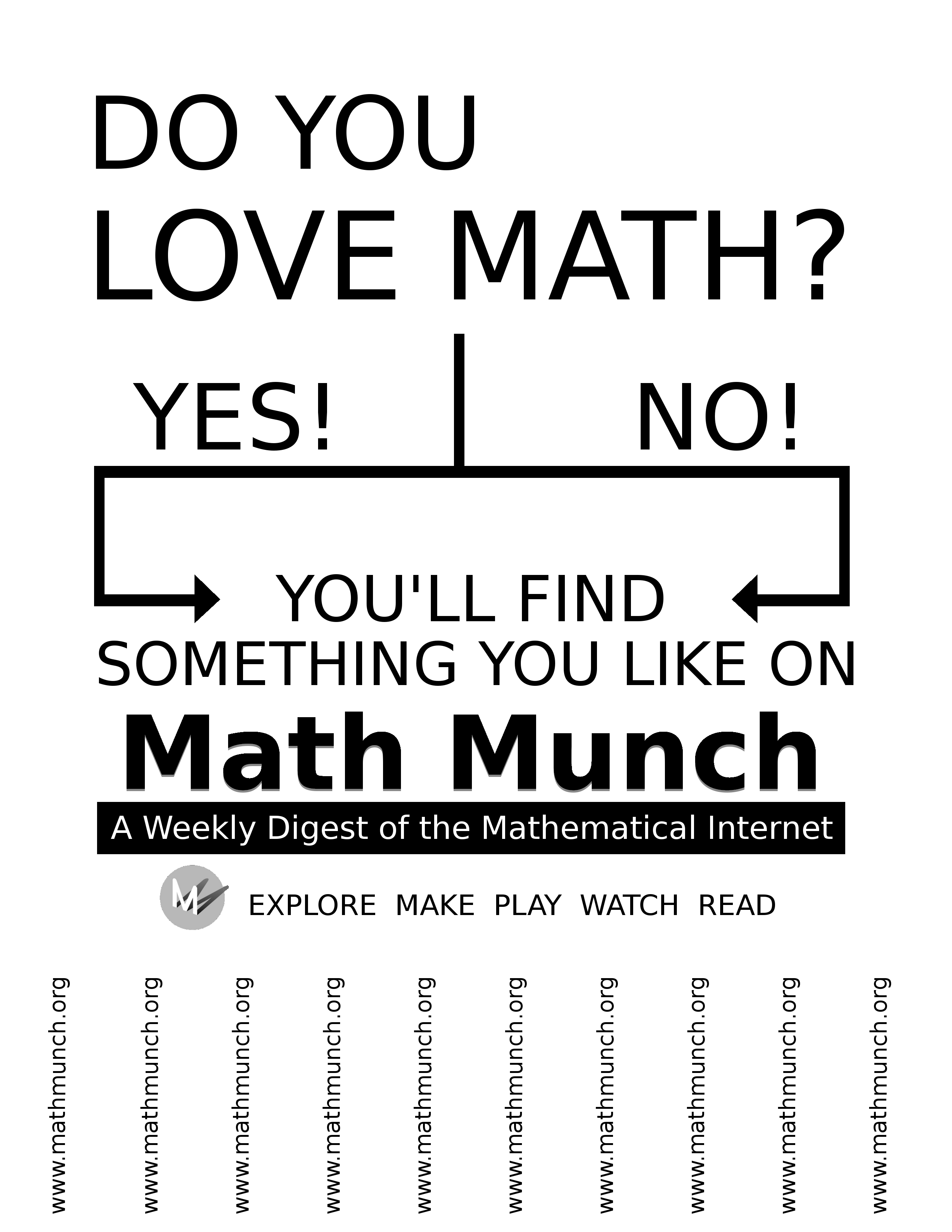 A great way to spread the word about Math Munch is to hang a flyer in your community where it might catch someone’s eye. It could be at your school, a library, a coffeeshop, a YMCA—anywhere in public that has some foot traffic. Below you’ll find a couple of flyers that you could hang up. Or you could make one of your own—let us know if you do!