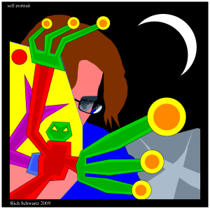 RES: I took a picture of myself using the computer’s camera and then I loaded the picture into xfig. Then I traced over it using the drawing program. For part of the picture, like my glasses, I zoomed way into the picture and tried to approximate the patches of color I saw on the screen with colored polygons. When I zoomed back out, the picture looked pretty realistic, much to my surprise. After I had drawn myself, I used the program to draw in a monster and an alien-looking background.