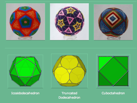 CY: Absolutely there are more solids to mimic! For one thing, there are fourteen different kinds of symmetry patterns for a sphere, and all fourteen can be done with temari. I demonstrated this in my chapter of Crafting by Concepts. The idea to investigate making the Archimedean solids was a later project for me. I only know how to make the Archimedeans that arise from truncation and duality. I don’t, however, know how to make the snub cube or snub dodecahedron. In fact, I have only made these three, but theoretically I know how to make all that arise from truncation. Other temari artists have surely made them, but some of the techniques are pretty advanced.