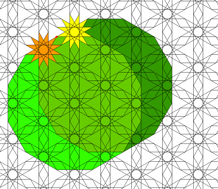 Take, for example, this beautiful star tessellation that he calls the Type 3. Jim describes how one way to make this tessellation is to replace the dodecagons in a tessellation called the 12.12.3 tessellation (shown to the left) with twelve-pointed stars. He uses the 12/5 star, which is made by connecting every fifth dot in a ring of twelve dots. Another way to make this tessellation is in the way shown above. In this tessellation, four polygons are arranged around a single point– a 12/5 star, followed by a dodecagon, followed by a 12/7 star (how is this different from a 12/5 star?), and, finally, a 12/11-gon– which is exactly the same as a dodecagon, just drawn in a different way.